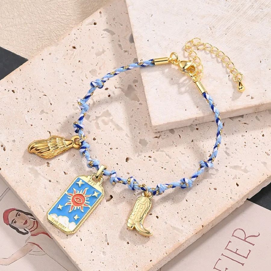 Set de Collar y pulsera con dijes de acero inoxidable y enchape de Oro de 18k larga duración y cadena de cordón de algodón.